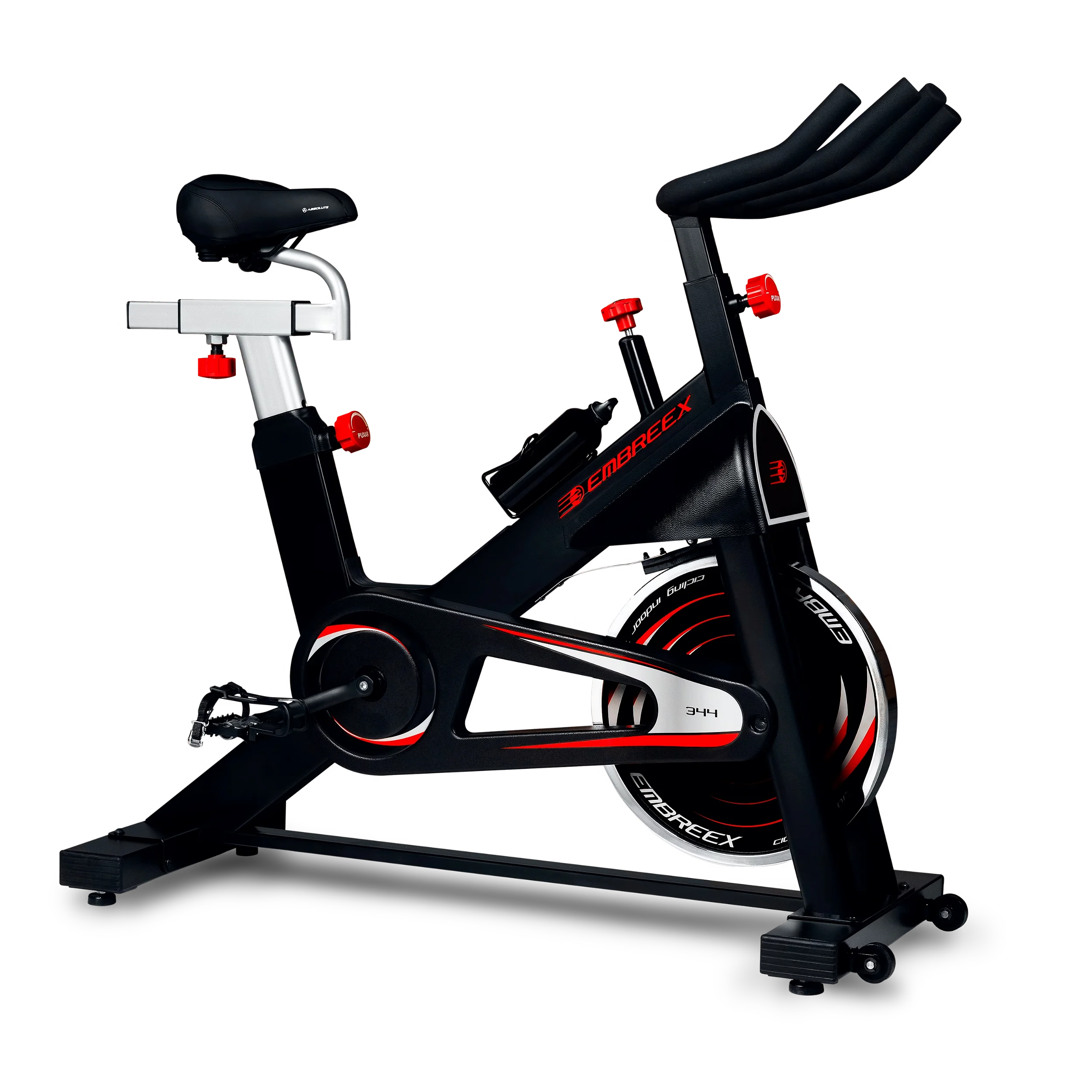 Os pedais são auto-balanceados, com alças de segurança para maior confiança em treinos avançados.A spinning bike 344 Smart possui um sistema de frenagem de segurança que pode ser acionado por um manípulo de fácil acesso, promovendo a parada do equipamento em caso de emergência.